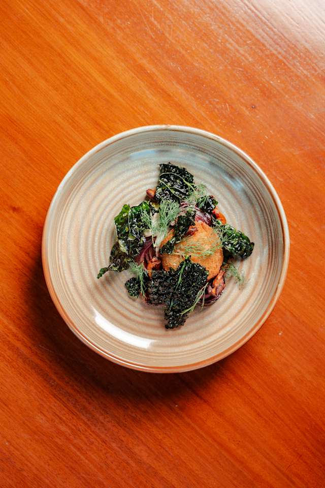 - Roasted, smoked fennel - creamy saffron sauce - parsley and nori oil - chickpeas - pickled fennel - samphire - garlic and fennelseed pangrattato