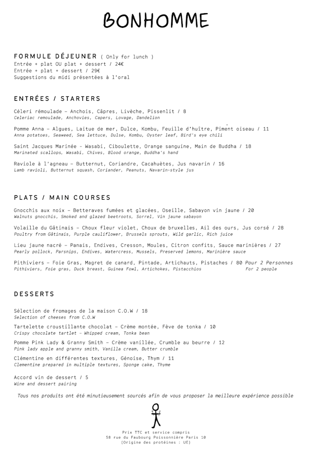 10/10We spent ages looking for a perfect Parisian restaurant until we landed on BONHOMME which ticked all the boxes, great aesthetic, great service, great wine and the greatest of food!