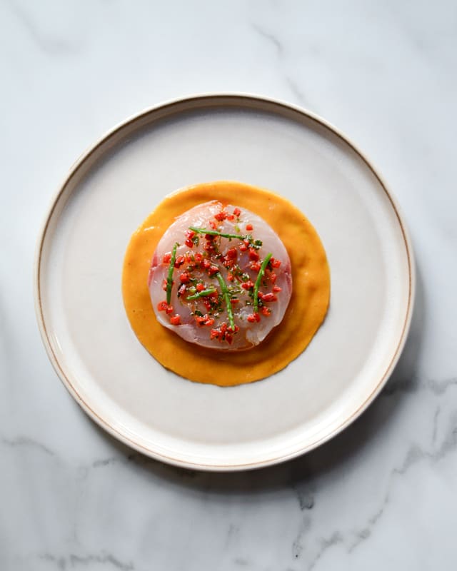 Pêches, croûtons, marjolaine, coulis de poivrons rôtis