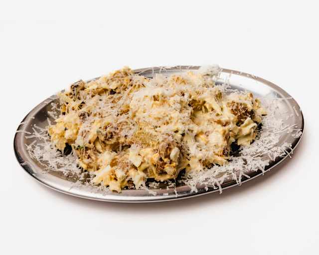 - Roast potatoes, house sauce, egg, pichle, onion, parmesan