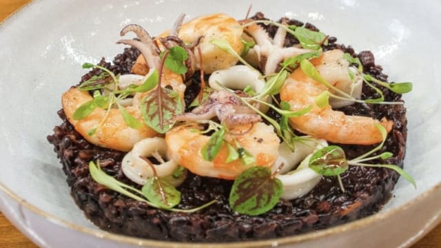 Fresh atlantic fish, shrimp bisque sauce, grilled vegetables, and black rice.