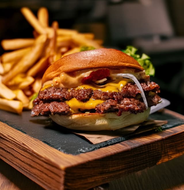 - Cheddar, lök, saltgurka och pommes frites. Ditt val av dressing, classic burger, barbecue, tryffel eller jalapeño