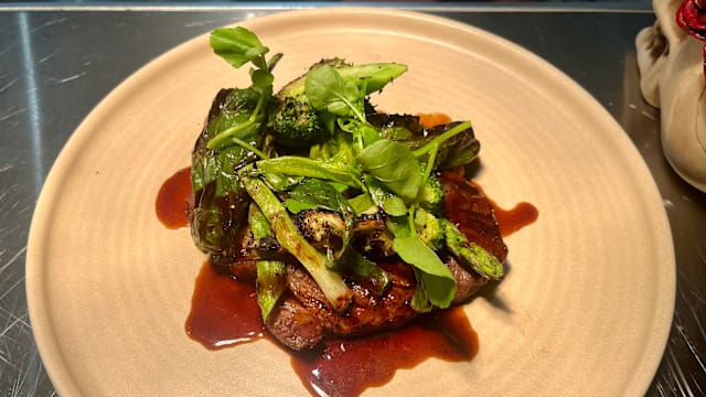 - Serveras med grillade grönsaker och pommes frites. Grillat över träkol och ditt val av en sảs ingảr. (chimichurri, rödvinsàs, romesco smör eller bearnaise)