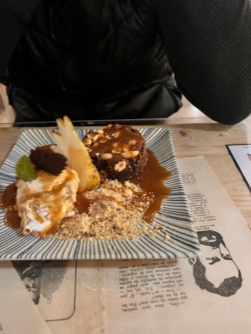 6.5/10Nice space to dine in with books obviously surrounding a library/club vibe with gentle jazz genre music. Myself and the leader of the opposition chose beer and a glass of house white while perusing the menu. My beer served ice cold in a glass taken from the freezer - nice. I ordered Tuna Tataki with smashed potatoes the opposition ordered mushroom risotto both were delivered 10 minutes later. The Tuna was delicious no complaints there but the risotto rice was very undercooked. Nobody came to the table to ask how the meals were and it was only when they came to take plates we were able to complain. The young man looked like he did not know what to do about a complaint asked if we wanted another one but we declined as we did not really have time. We did order dessert Fruit salad (you can’t muck that up) and pavlova which was great. When we got the bill €80 the offending risotto was on there and no reduction We left but note please check with diner’s shortly after serving dishes.