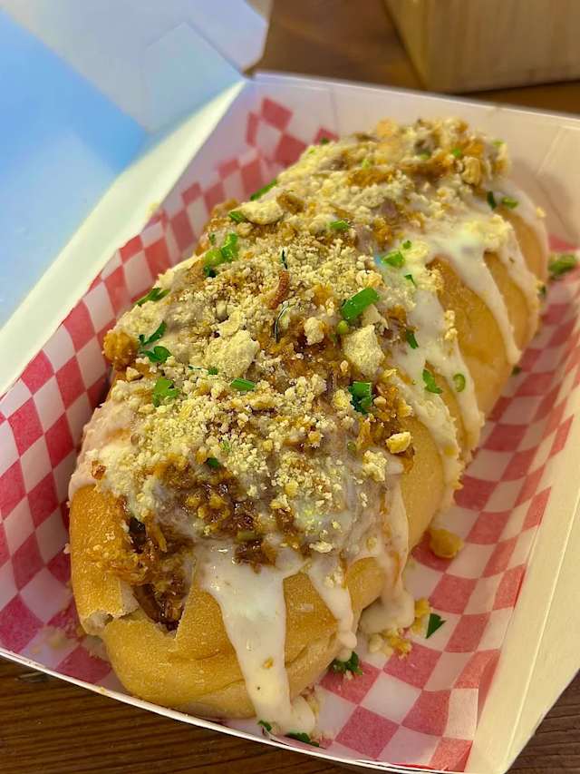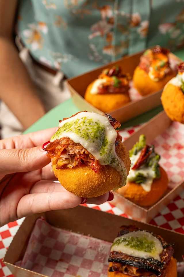 Potato croquette filled with pulled pork roast cooked in a pignata, sgamata mayonnaise and homemade pickled gherkin