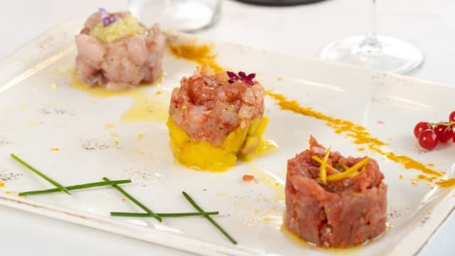 Mozzarella di bufala dop campana, tartare di tonno rosso, datterino, polvere di olive nere, cipolla croccante, basilico, olio evo