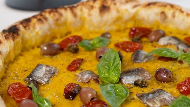 Pomodoro schiacciato a mano, fiordilatte di napoli, alici dei nostri mari, olive taggiasche, basilico, olio evo
