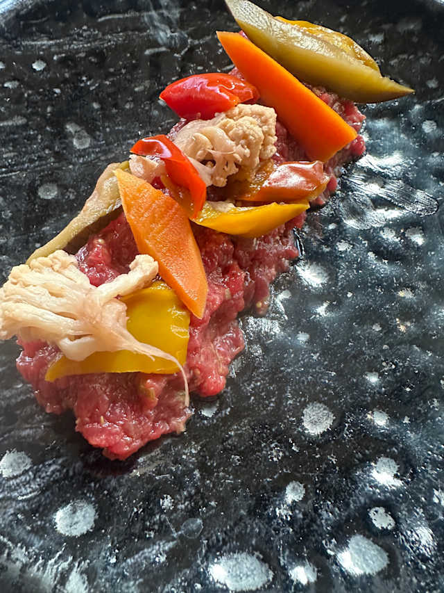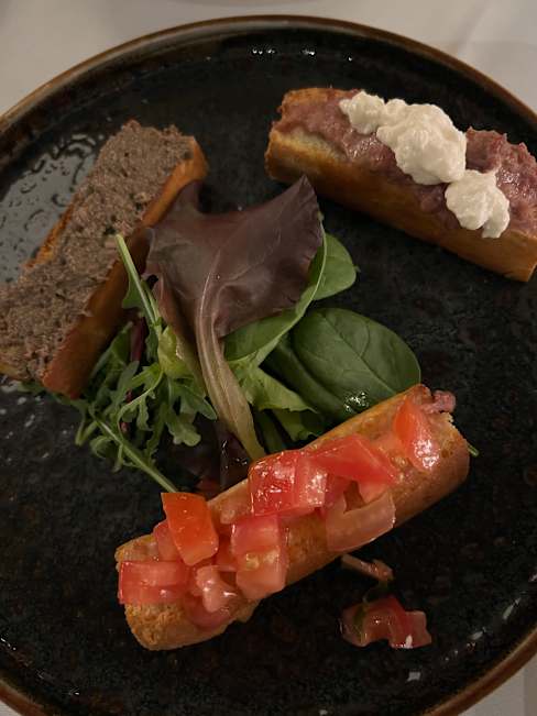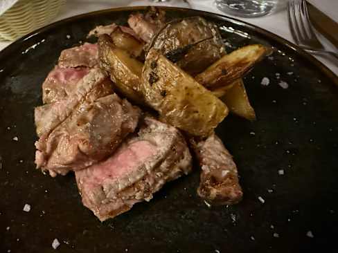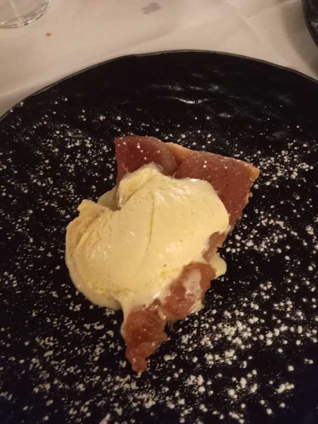 8.5/10The place is trendy, indoor temperature was cool.There was a large group dinner which was a bit noisy. When they finally left, the noise level went down significantly. The staff was super attentive. I had a beef tartare; the capers had too much vinegar so I would have preferred them on the side rather than on top of the meat. I then had pasta which was super tasty but arrived cold. The wine list was good but only 2 reds to choose from by the glass. All together dinner was good.