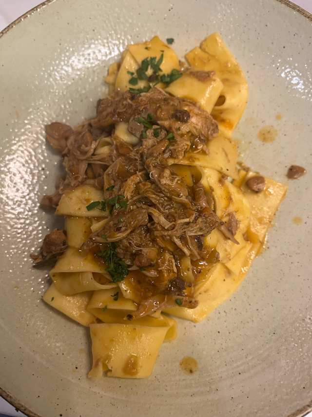 - Pappardelle avvolte in un ragù delicato di coniglio, aromatizzato con erbe toscane