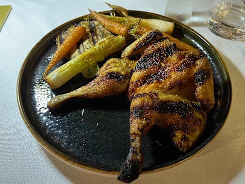 7.5/10A good restaurant outside the beaten path, open on a Sunday evening. The menu was OK, some surprising offers (burger), but the tagliatelle (not restaurant-made) with vongole were good, as was the very properly made melanzana with zucchini. My partner, on the other hand, had a dry, half roasted chicken with some cooked vegetables slapped on a large plate. The wines are largely overpriced, with few less than €50 per bottle. If there wasn't a 30% reduction applied to the meal, the whole thing would have been ridiculously overpriced. It was thus, luckily, just very overpriced, like your usual tourist trap.