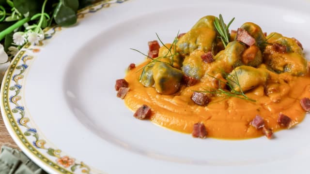 gnocco di patate guarnito con pesto di arancia limone e mandorle