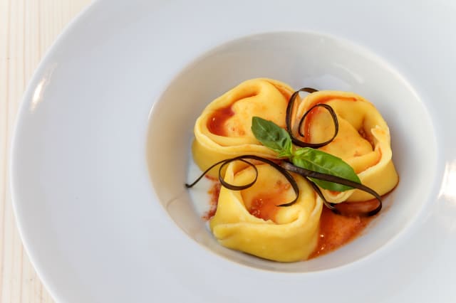 Tortello di pasta fresca ripieno di stracciata di bufala, guarnito con pomodori e scaglie di parmigiano