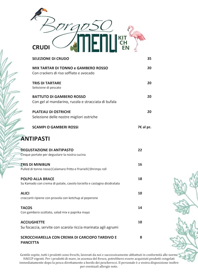 10/10We have driven by Borgo 50 for a year and a half and kept saying we have to eat there. We finally made it for lunch and were not disappointed !! The food, service, and ambiance were excellent. We were warmly welcomed with a free glass of Prosecco and treated to free Lemoncello after our meal (which was awesome) the service throughout the meal was first class. The 4-5 types of bread served with the meal were warm and uniquely made. All the pasta and fresh catch of the day dishes were gourmet and beautifully presented- besides being unique and delicious. Highly recommend!