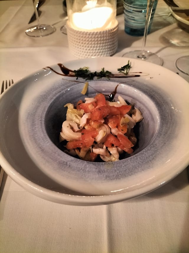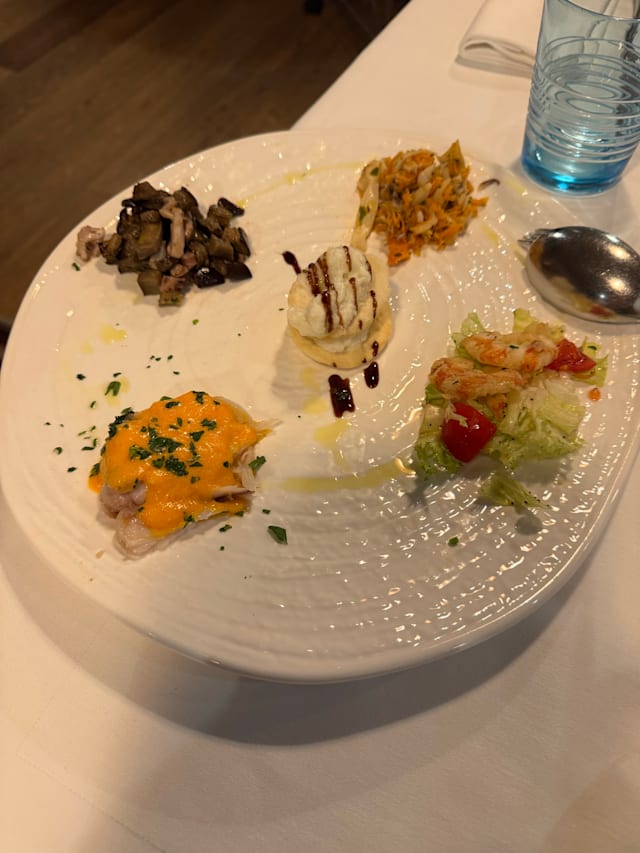 comprende: Polipo, melanzane e finocchietto, Calamaro e julienne di carote croccanti, Razza e crema di peperoni, Millefoglie di baccalà mantecato e timo, Gamberone allo zenzero e peperoncino fresco con riccia