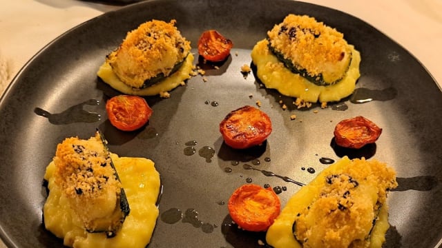 Zucchine gratinate con baccalà, olive taggiasche e purè di patate allo zafferano