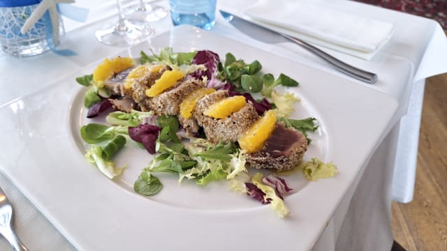 Tataki di tonno marinato con sesamo e semi di soia, misticanza e arancio