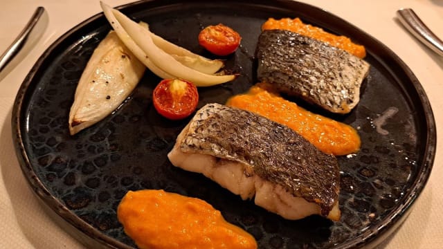 Branzino su letto di finocchio croccante e salsa catalana