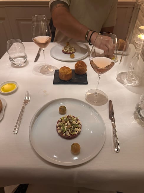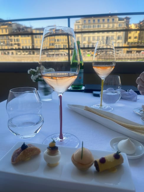 10/10An excellent experience from start to finish. The food was absolutely delicious — this place truly deserves its Michelin star. Service was top-tier: kind, attentive, and thoughtful. I celebrated my birthday here this year, and they made it special with a surprise dessert and one of the best tables by the window, overlooking Florence and the river — even though we booked last minute. That gesture meant a lot. We chose the chef’s 7-course tasting menu with wine pairing. Everything was exquisite, but honestly… so much food! Before the actual courses, we already had five amuse-bouches, bread, and some extras. By the fifth course (the meat), I was full — and I usually eat a lot! The meat was incredible, but finishing it was a challenge 😅 Bonus points for the olive oil — they introduced it during the meal, and I loved it so much I bought a bottle to take home. Overall, unforgettable night. Would absolutely recommend.