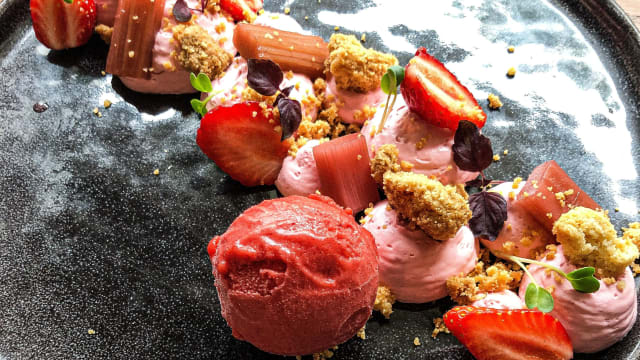 Cœur coulant au chocolat, tuile choco-cardamome, mousse et sorbet framboise