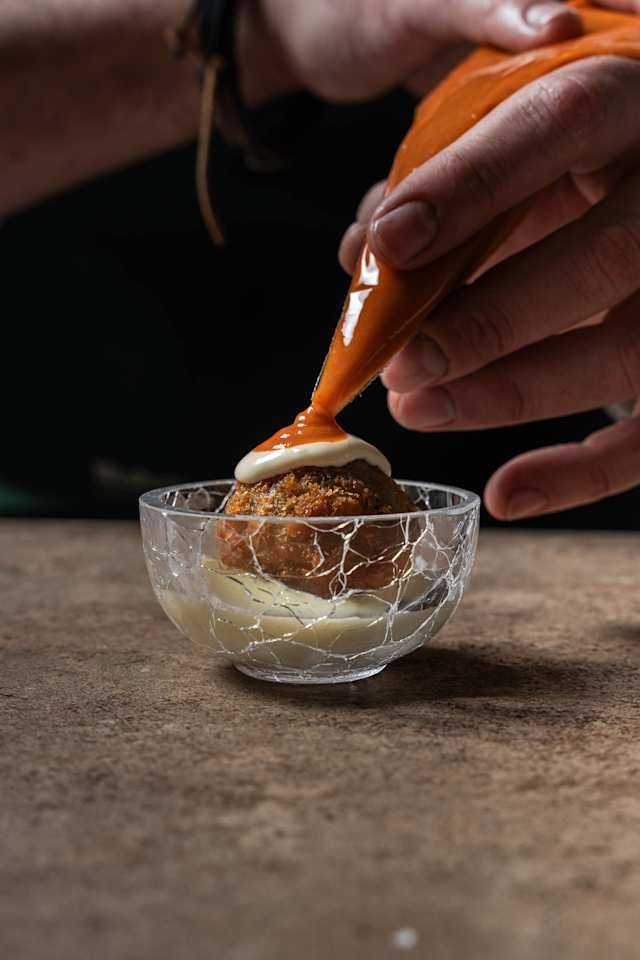 - Base de galta guisada, parmentier suau i doble salsat brava–allioli.