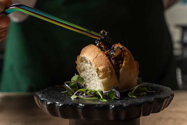 - Vaca moixina, mostassa dijon, rovell curat i pa torrat cruixent.