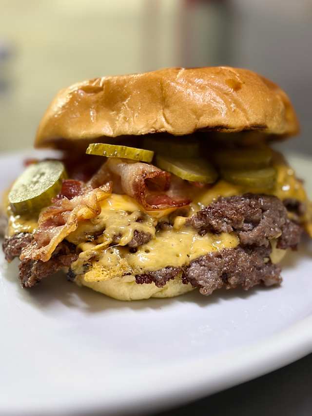 - Hamburger, cheddar, cetrioli, bacon, insalata, uovo, anelli di cipolla