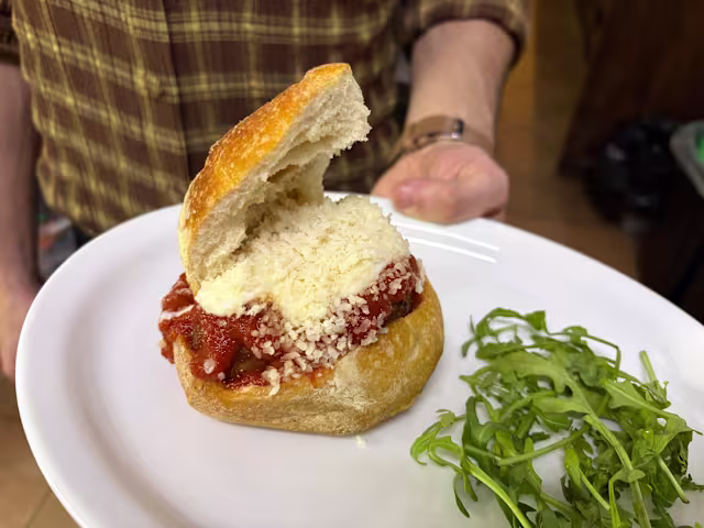 - Hot-dog di polpette al sugo aromatizzato, fonduta e prezzemolo