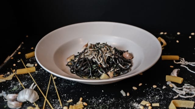 Pasta negra, aceite de oliva, caldo de mariscos, ajo, guindillas, gulas, gambón y perejil.