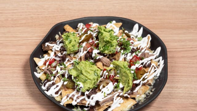 Patatas crujientes cubiertas con queso fundido, frijoles, guacamole, y pico de gallo vibrante.