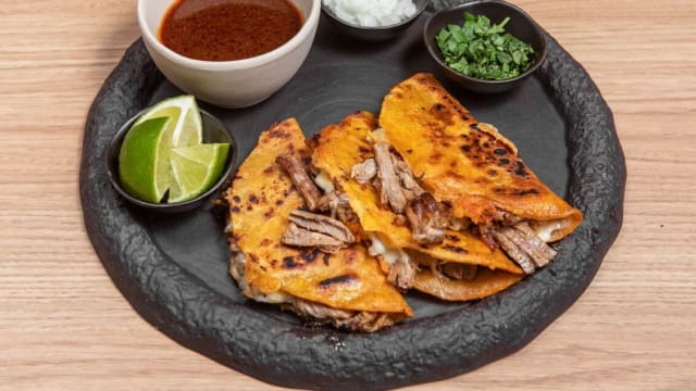 Una deliciosa mezcla de carne de res tierna y chorizo, acompañada de cilantro, cebolla y limón.