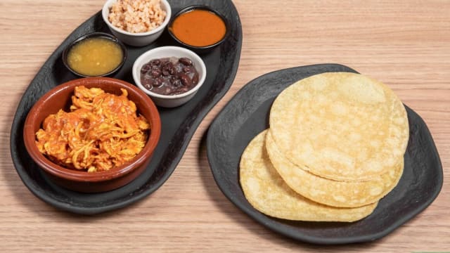 Para 3 o 4 personas. Cuatro cazuelas de tu elección. Incluye 12 tortillas, 2 guarniciones, guacamole y salsas.