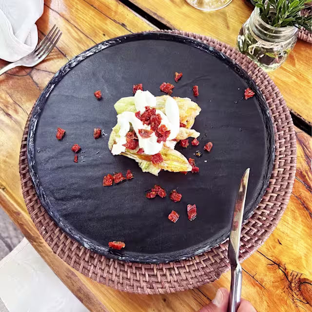 - Ravioli neri ripieni di baccalà su ristretto di pomodoro, capperi ed olive