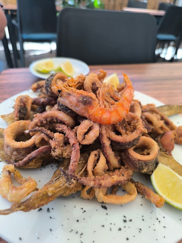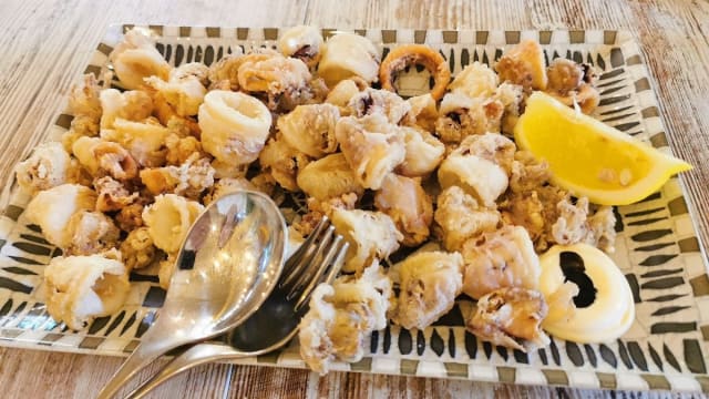 Escombros, troceado de calamar rebozado con “all i oli” de rocoto