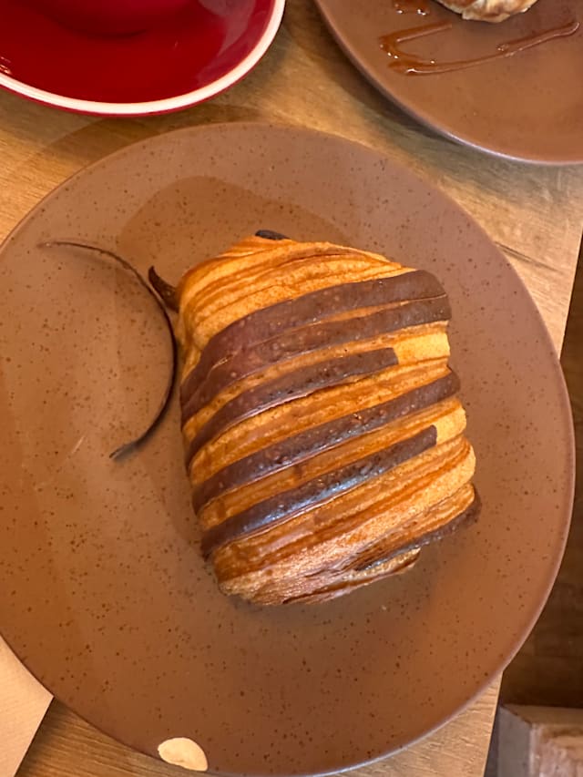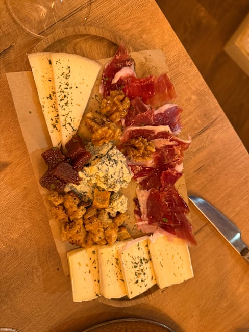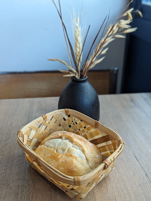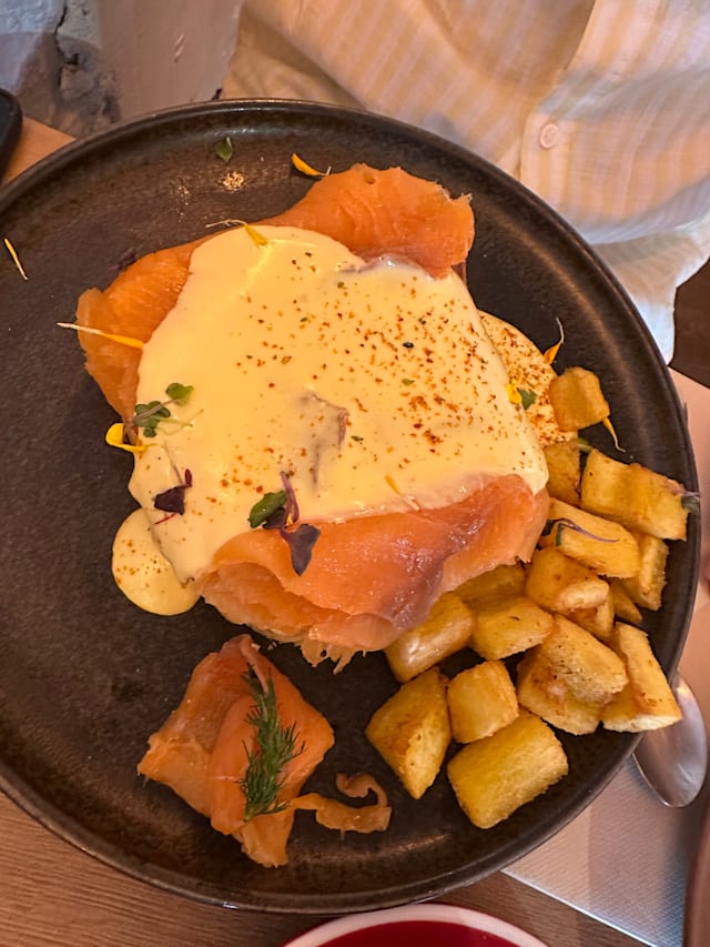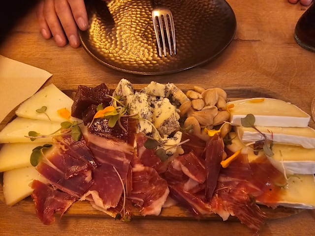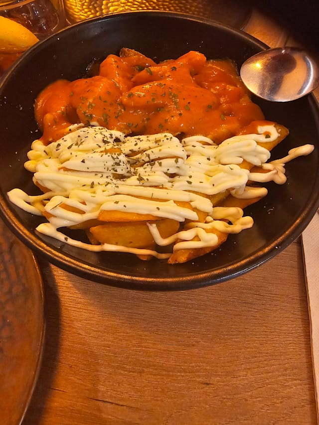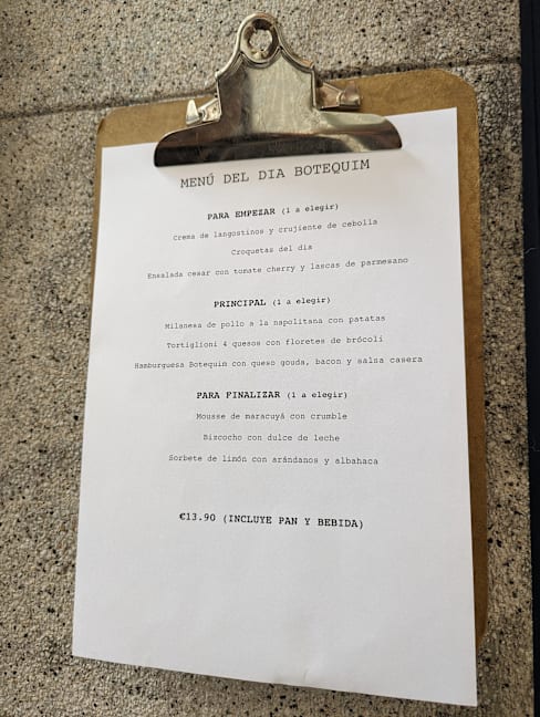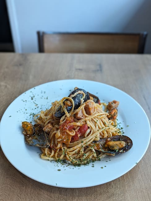 9/10+4This Spanish-Italian fusion bistro features an interior decorated in dark blue and wood tones. Seating is limited, but there are high chairs at the bar. The waiter was very friendly and honored my reservation request, seating me by the window. I tried their weekday lunch menu, which costs 13.90 EUR and includes a starter, main course, dessert, bread, and a drink. I chose the Croquetas de salmón con mayo kimchee, Linguine en salsa roja de atún y mejillones, and Mousse de maracuyá con crumble. All the dishes were very tasty, well-seasoned, and reasonably portioned. This is a great place to enjoy a meal with friends or have a proper lunch on a weekday without spending too much. I'm looking forward to trying more dishes in the future. The restaurant is located in the Malasaña area, where young people gather, creating a vibrant atmosphere.