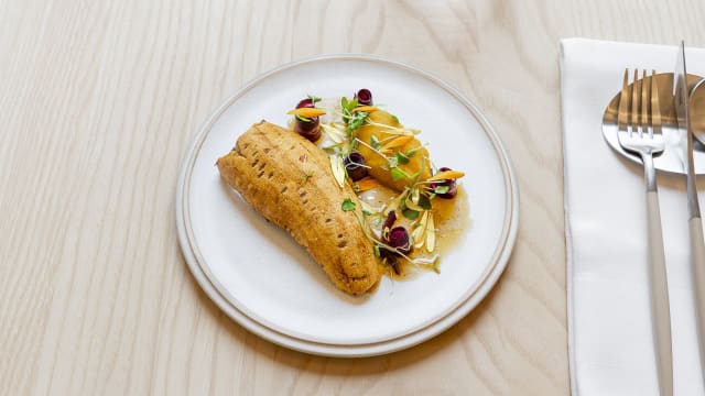 Crushed new season potatoes, fresh herbs, lagareiro sauce & charcoal grilled peppers.