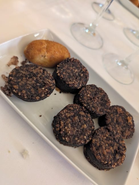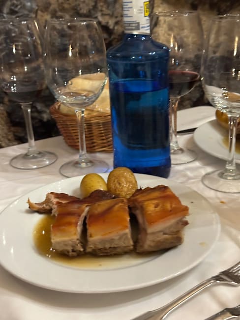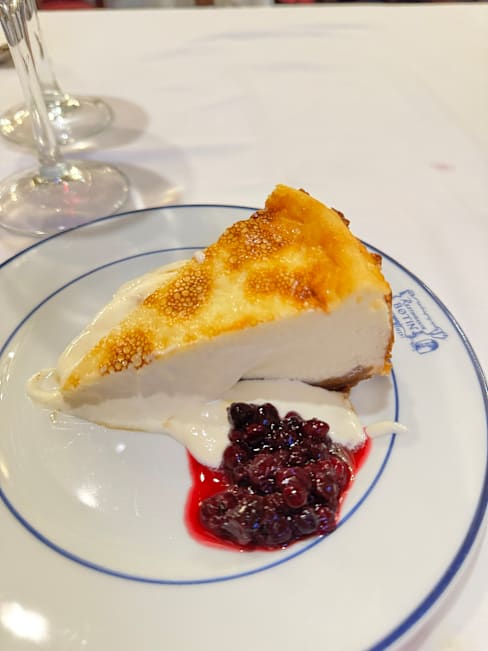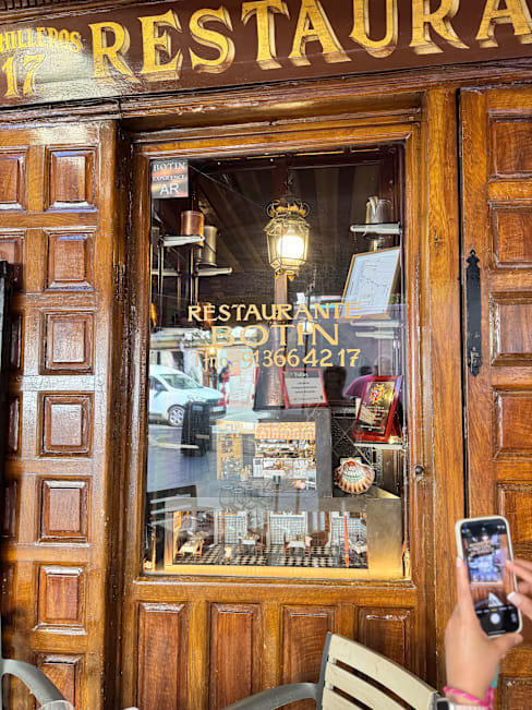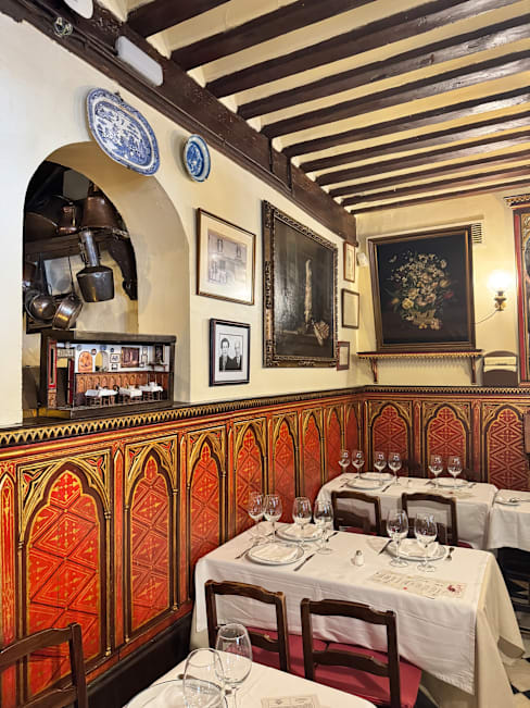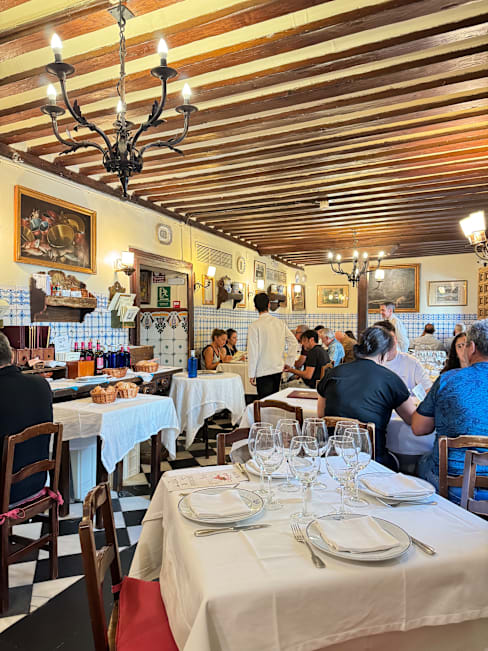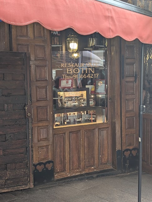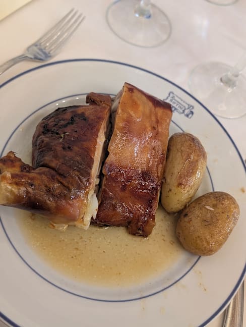 7/10+3We had reservations so there was no wait, but you can’t choose where to be seated. Most of the staff don’t speak much English, which made ordering a little challenging. We tried the famous cochinillo—unfortunately, it was just okay. The meat was a bit bland, not served hot, the skin wasn’t crispy, and we were given a less appetizing cut of the pig. My partner was celebrating her birthday, but nothing special was done for the occasion, which was disappointing given the reputation. The highlight of the meal was definitely the cheesecake—honestly one of the best we had in Madrid!