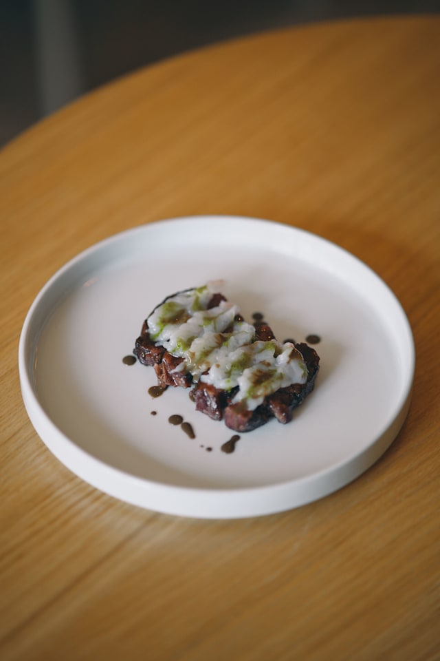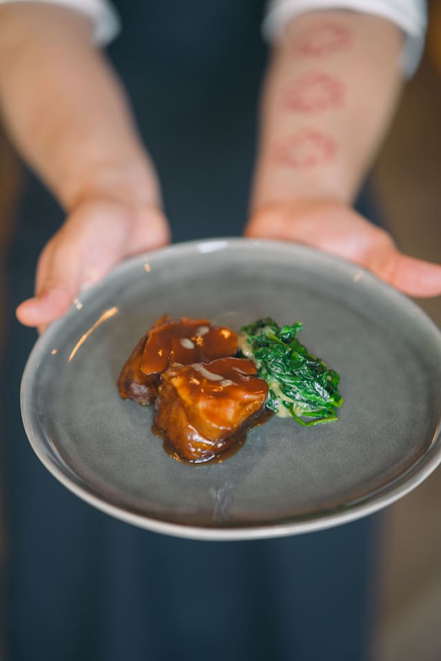 Guancia di pata negra, amarone, menta, pinoli, sedano rapa