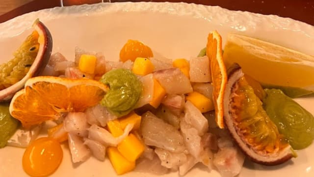 - Con guacamole, mango e passion fruit