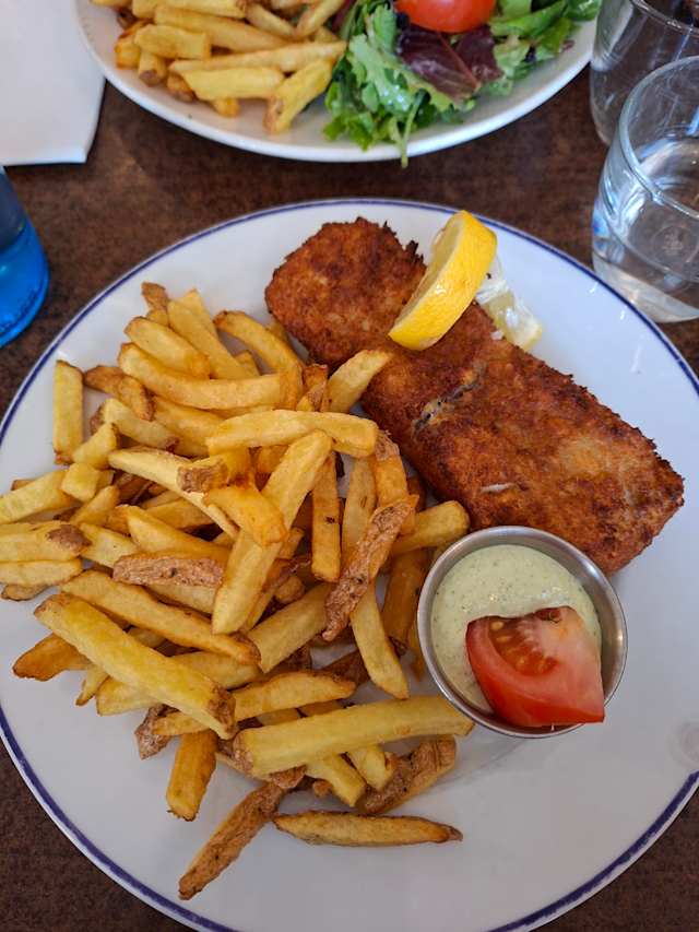 - Lieu noir pané maison, sauce tartare, pickles, cheddar maturé, servi avec frites et salade