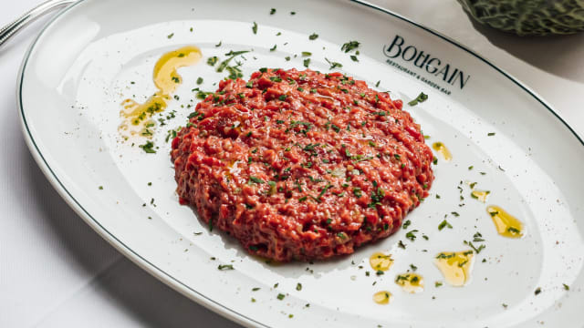 - O tradicional, cortado à faca servido com salada verde e batatas fritas/ The traditional hand-cut beef tartare served with green salad and French fries.