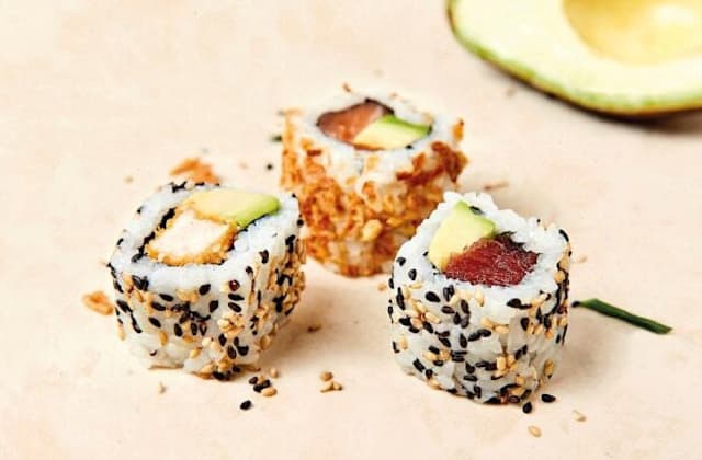 6 Maki sans algue saumon ,8 rainbow avocat fresh, 6 maki sans algue avocat