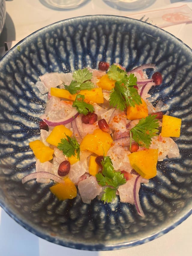 Dés de daurade, lait de coco, citron vert bio, mangue, avocat, grenade, piment d’espelette, coriandre, oignon rouge, sel de guérande, accompagné d’un riz vinaigré