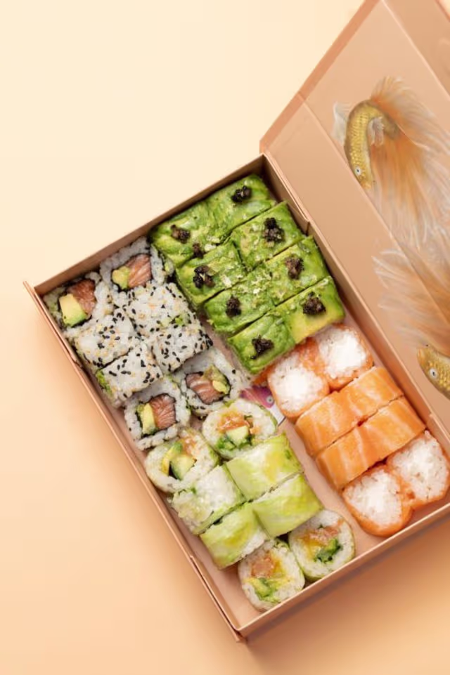 - 6 Maki sans algue saumon ,8 rainbow avocat fresh, 6 maki sans algue avocat