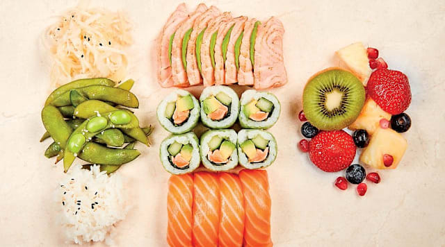 6 Maki sans algue saumon ,8 rainbow avocat fresh, 6 maki sans algue avocat