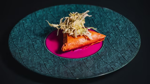 - Triangolo di pasta brick alle tre carni su salsa di barbabietola al latte di kefir e insalata di bergamotto