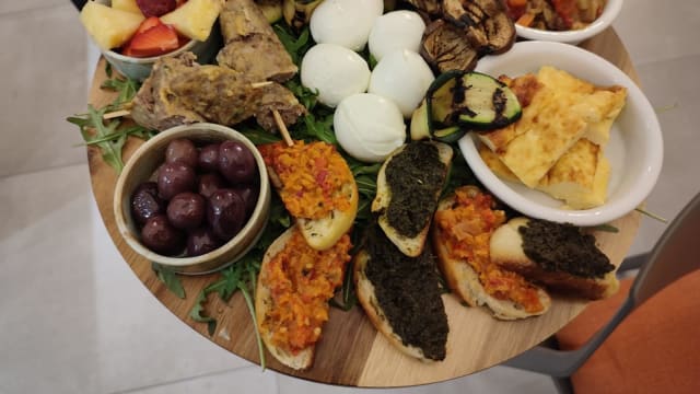 Parmesan, caponata, olives, buffalo mozzarella, dried tomatoes, artichokes, baked potatoes, meatballs, ricotta and vegetable flan, accompanied by flavored roast bread and breadsticks