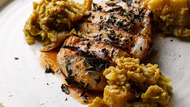 Zucca, crema all’aglione toscano, noci e guanciale di maiale brado