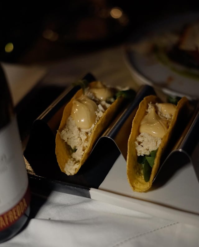 Taco di polenta, insalata verde, tonno di gallina bianca **di saluz zo dell'azienda mieti (to), cipolla rossa marinata e sedano verde croccante (2pz)