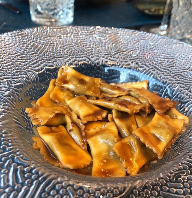 Raviolo artigianale piemontese di pasta fresca, carne e verdura, pastificio bertoli (vc)con il suo sugo d'arrosto