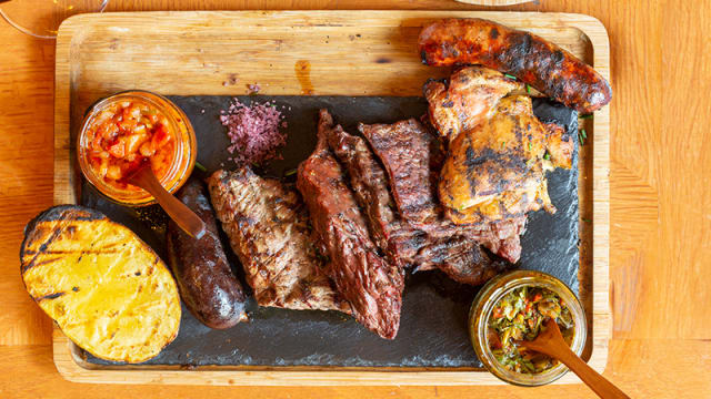 Sirloin, rib eye, skirt steak, strip of roast, flank steak, pork secret, chorizo and creole blood sausage